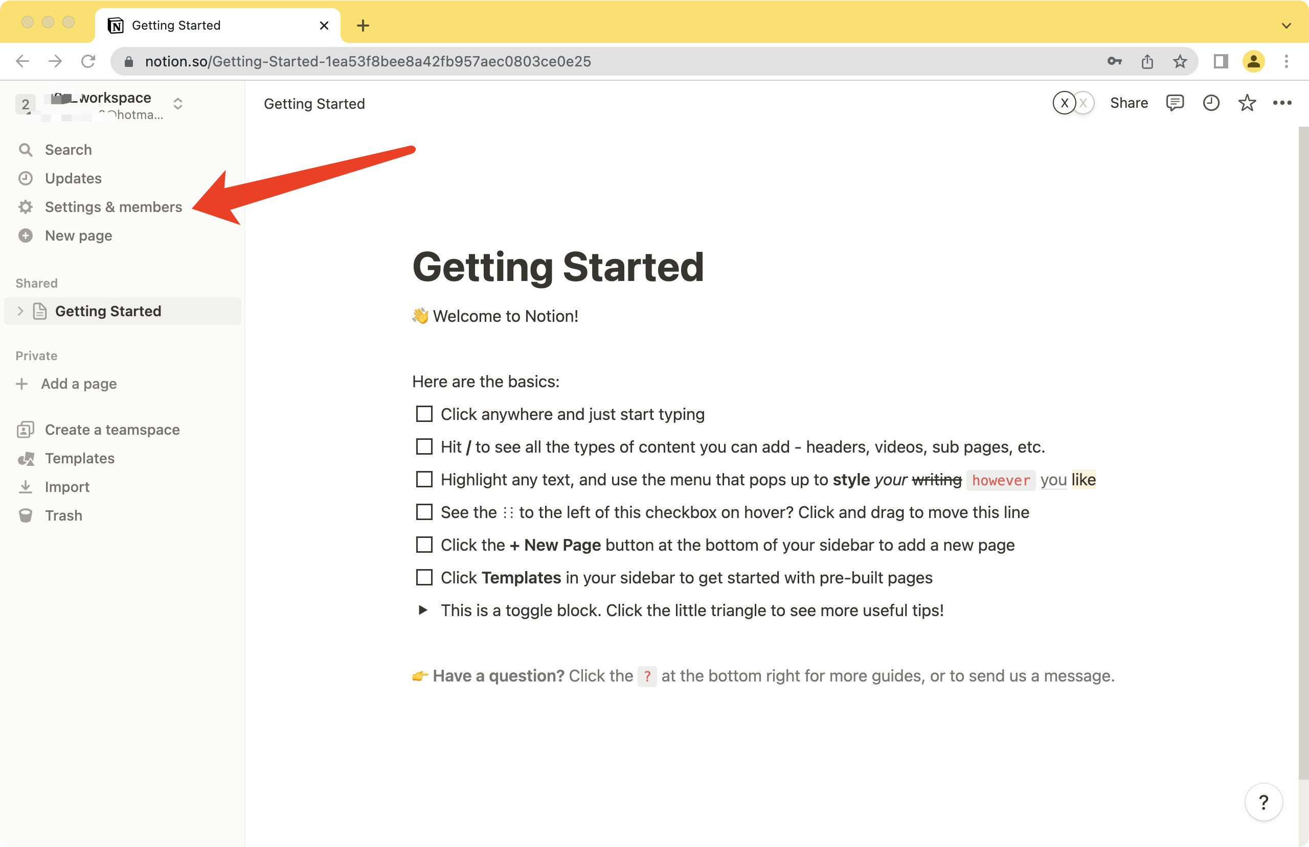登录您需要激活的notion账号,然后点击设置(Settings & members),进入设置界面。