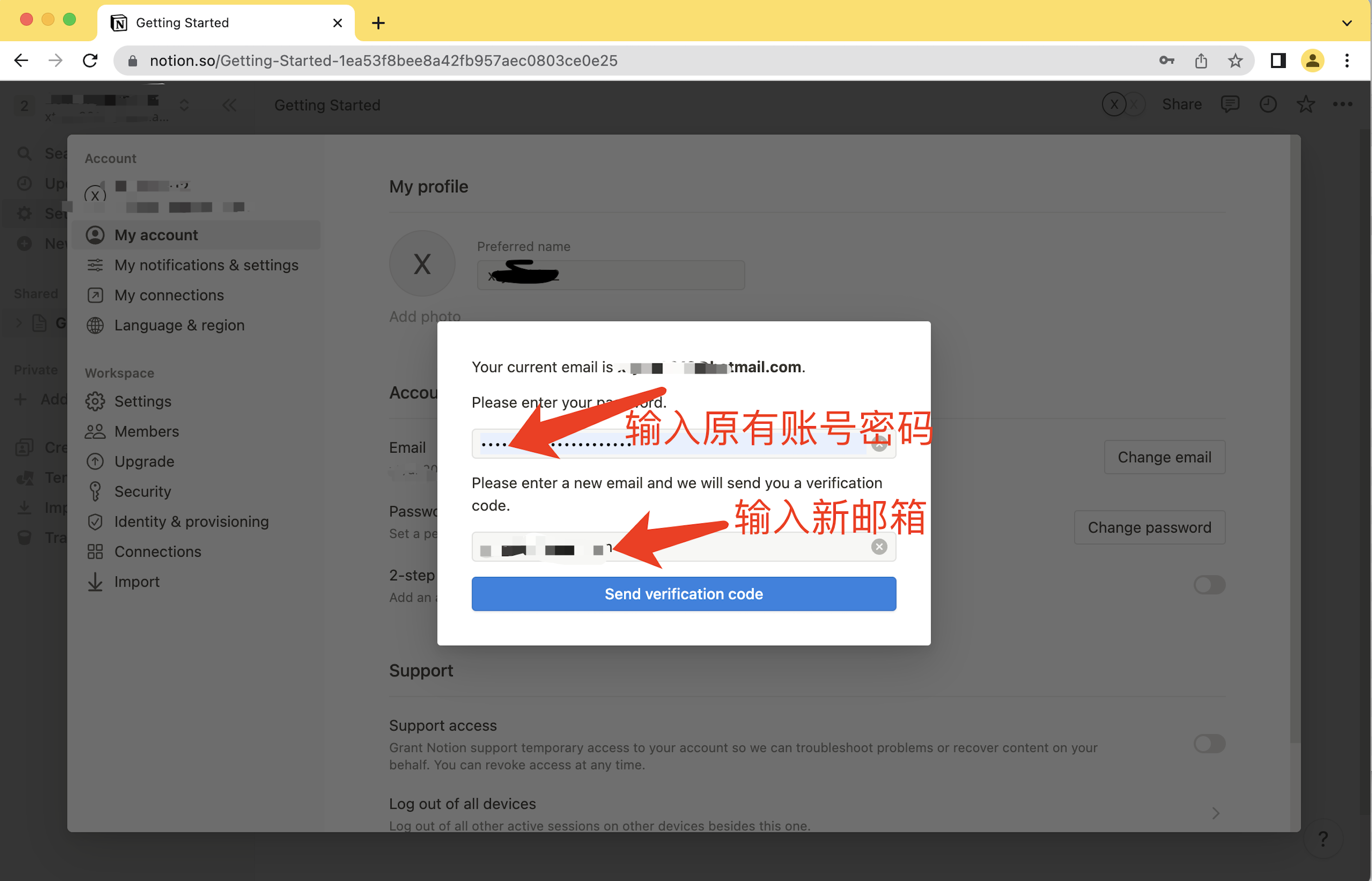 点击左侧的账户(account),并且在右侧点击修改邮箱(change email),修改邮箱为notion认证的邮箱。